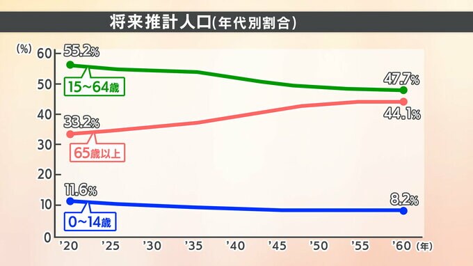 14歳までの子どもが占める割合は11%から8%に減り、生産年齢人口である15~64歳も55%から47%に減少。その一方で、65歳以上の高齢者が占める割合は10%以上増え44%になる計算です。