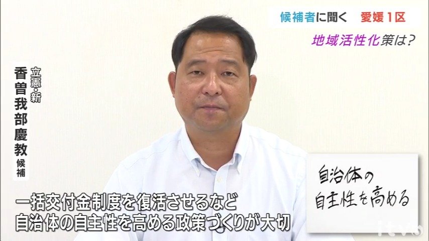 香曽我部慶教候補のキーワードは「自治体の自主性を高める」です。
