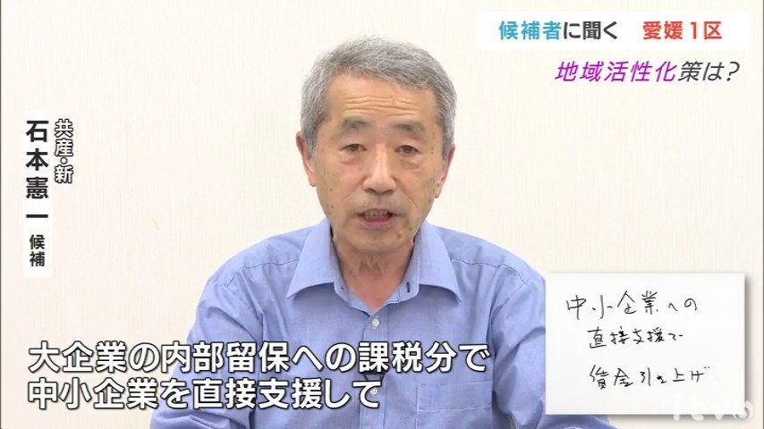 「働く人の賃金が上がらないと地域経済は明るくなりません。大企業の内部留保への課税分で、中小企業を直接支援して、全国一律最低時給1,500円を実現します。愛媛では年金も家計収入の中で大きな比重を占めています。物価高騰にふさわしく年金も引き上げます。輸入自由化を抑え、農林水産業の支援策を強めます」