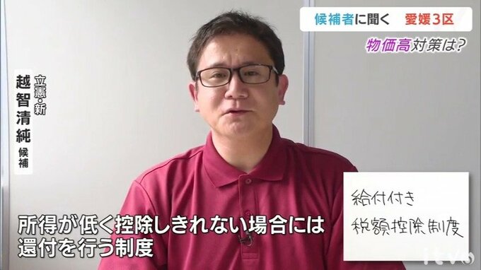 「この制度は消費税還付法案とも言われるように、所得の少ない世帯ほど、消費税の負担割合が高くなるという消費税の逆進性の問題点を緩和することを目的としています。つまり、一定の所得がある人には税額控除を与え、所得が低く控除しきれない場合には還付を行う制度です。立憲民主党ではアベノミクスで広がった格差を是正し、分厚い中間層の復活に全力で取り組みます。愛媛県においても中小企業の支援や農業などの一次産業の振興を通じて、中間層が安心して成長できる環境を整えることを目指します」