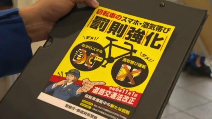 自転車の“ながらスマホ”と“酒気帯び運転” 1日から罰則強化 ながらスマホは6か月以下の懲役または10万円以下の罰金 2024年11月1日(金) 20:13 国内 1日から道路交通法が改正され、自転車のながらスマホと酒気帯び運転の罰則が強化されます。これにあわせ、愛媛県警バイシクルユニットの隊員らが松山市内のスーパーに出向き、買い物客に自転車のながらスマホと酒…