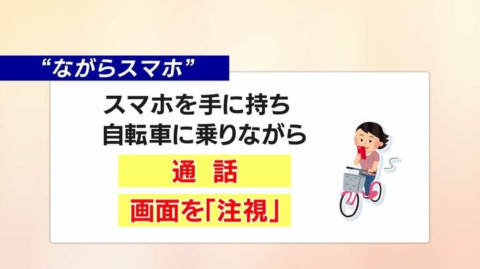 自転車に乗りながらスマホを使用する“ながらスマホ”。スマートフォンを手に持った状態で、自転車に乗りながら通話する行為や、画面を注視する行為が該当します。