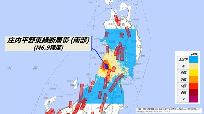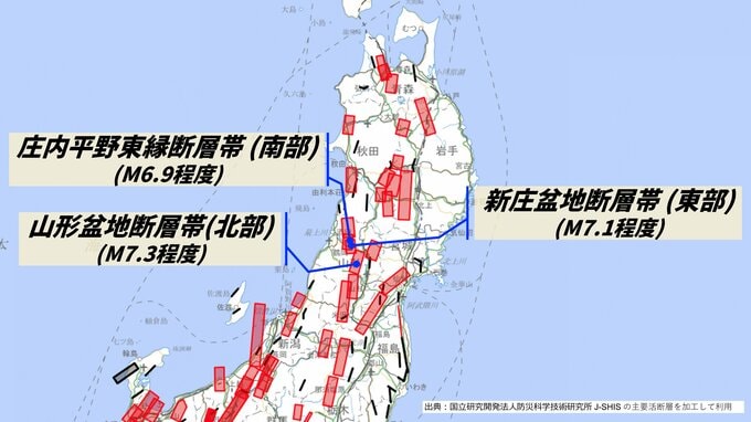 【Sランク活断層一覧】日本全国の活断層、最高Sランク以下のZランクでも大地震の可能性…約2000の活断層以外に、未知の“隠れ活断層”も 2025年1月24日(金) 18:00 国内 主要活断層一覧(東北 評価Sランク) ▼山形県 庄内平野東縁断層帯 (南部)(6.9程度 ほぼ0%~6%) 山形盆地断層帯(北部)(7.3程度 0.003%~8%) 新庄盆地断層帯 (東部)(7.1程度 5%以下)