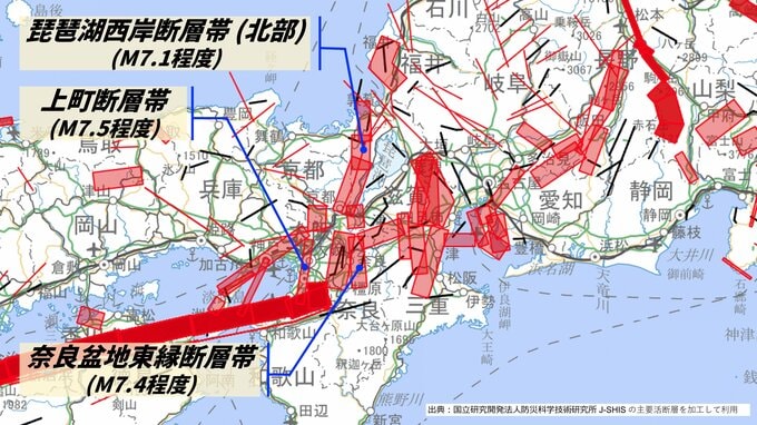 【Sランク活断層一覧】日本全国の活断層、最高Sランク以下のZランクでも大地震の可能性…約2000の活断層以外に、未知の“隠れ活断層”も 2025年1月24日(金) 18:00 国内 主要活断層一覧(近畿 評価Sランク) ▼滋賀県 琵琶湖西岸断層帯 (北部)(7.1程度 1%~3%) ▼大阪府 上町断層帯(7.5程度 2%~3%) ▼奈良県・京都府 奈良盆地東縁断層帯(7.4程度 ほぼ0%~5%)