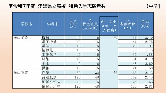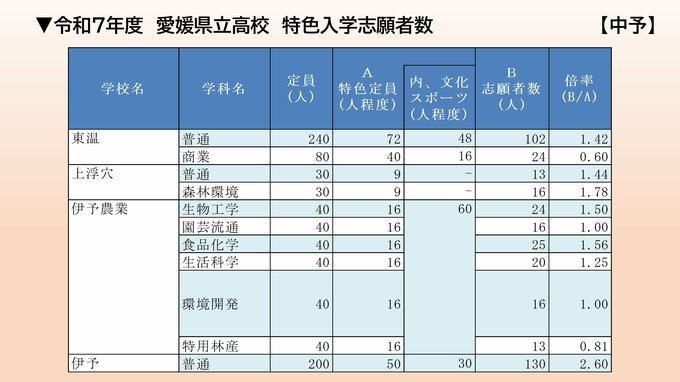 愛媛県立高校入試 2025年 特色入試志願状況 全体1.65倍 松山東3.16倍 松山南4.09倍 今治西2.28倍【全高校・全学科掲載】