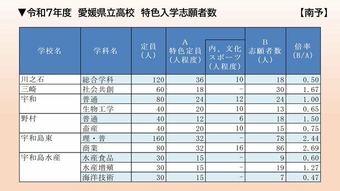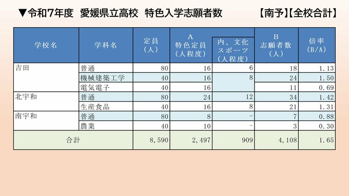愛媛県立高校入試 2025年 特色入試志願状況 全体1.65倍 松山東3.16倍 松山南4.09倍 今治西2.28倍【全高校・全学科掲載】