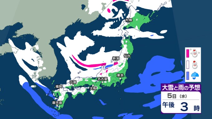 【今季最強寒波】立春だけど…4日頃から北日本~東日本の日本海側、西日本を中心に“大雪のおそれ” 警報級の大雪の可能性も【雪の最新シミュレーション】 2025年1月31日(金) 15:16 国内 ▼雨と雪の予想(1月31日~2月5日)【2月5日】