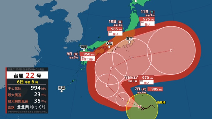 【台風22号】非常に強い勢力、950hPaへ発達し日本へ接近か 南西諸島と東日本に影響の可能性【台風情報、雨と風のシミュレーション】6日9時更新