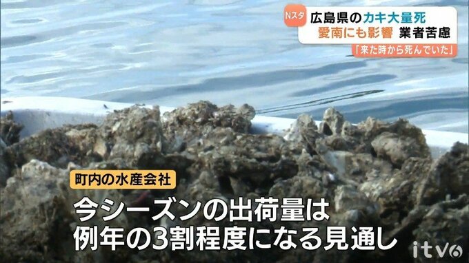 広島で発生のカキ大量死 愛媛県内へも波及 仕入れの8割が死ぬ 出荷量は例年の3割に 2025年11月20日(木) 20:07 国内 広島県で発生しているカキの大量死の影響が、県内有数の産地・愛南町にも広がっています。愛南町では広島で2年ほど育成されたカキを、例年、10月から11月にかけて仕入れ、御荘湾を中心に養殖しています。…