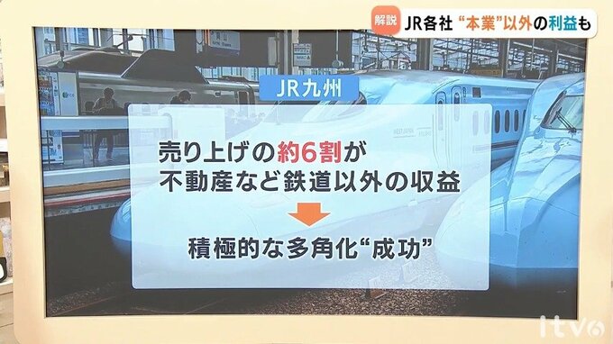 JR九州の場合は、その傾向はさらに顕著で、売り上げのおよそ6割を不動産など鉄道以外の収益が占めています。民営化当初は経営の先行きに不透明感があるといわれていましたが、積極的な多角化が成功したといわれています。