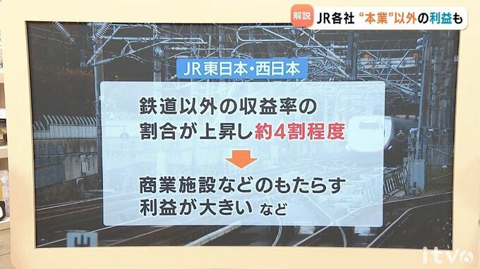 一方で、東京と大阪に拠点を置くJR東日本と西日本の場合、鉄道以外の収益率の割合が上昇し、およそ4割程度。巨大都市圏で運営する商業施設などのもたらす利益が大きいことが、その要因のひとつとなっています。