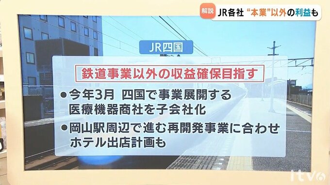 鉄道事業以外での収益確保を目指すJR四国は、ことし3月には、四国で事業を展開する医療機器商社の株式を一部取得し子会社化したほか、岡山駅周辺で進められている再開発事業に合わせてホテル出店も計画するなど、多角化を進めています。