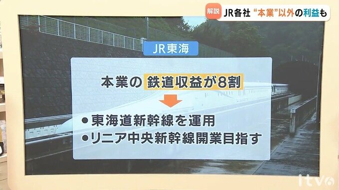 まずこちら、ドル箱の東海道新幹線を運用していて、さらにはリニア中央新幹線の開業も目指すJR東海は、売り上げのおよそ8割を本業である鉄道収益が占めています。