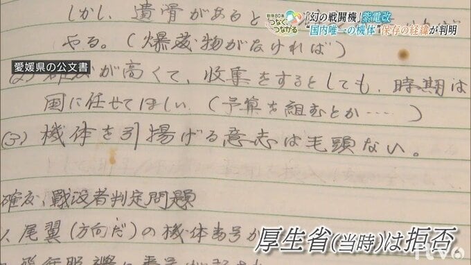 公文書によりますと、発見の翌月から、愛媛県が「国民的感情からしても機体を引き揚げて確認する必要がある」などと、当時の厚生省に機体の引き揚げと遺骨の調査を繰り返し要請。