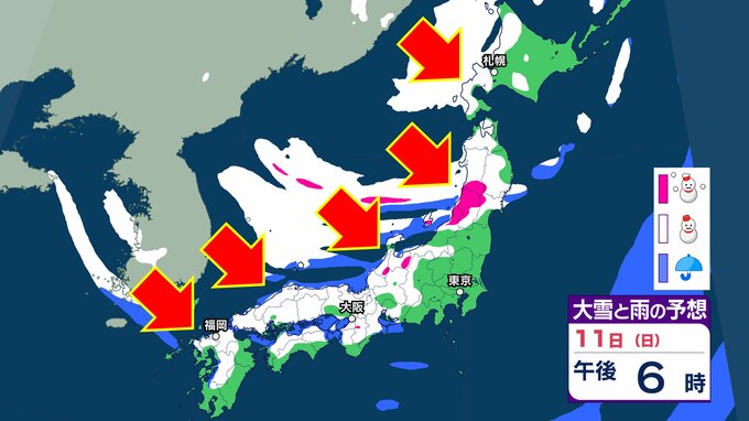 【大雪情報】成人の日・12日頃にかけて日本付近に強い寒気「10年に1度レベル」大雪か 日本海側を中心に北海道、東北、北陸、東海、近畿、中国、四国、九州の広い範囲で雪予想【気象庁・早期天候情報】 2026年1月8日(木) 15:30 国内 また、雨と雪のシミュレーションによりますと、11日にかけては、日本海側を中心に、北海道、東北、北陸、東海、近畿、中国、四国、九州の広い範囲で雪が予想されています。 引き続き、最新の気象情報をご確認ください。