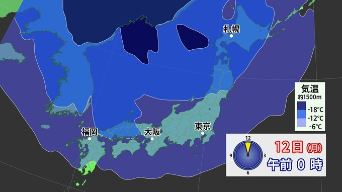 上空約1500m付近の寒気の予想を見ると、12日頃にかけて、中国地方まで氷点下12度以下の強い寒気が流れ込み、強い冬型の気圧配置となる予想です。