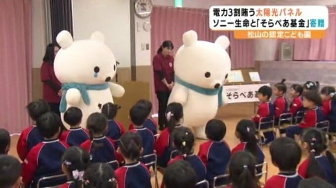認定こども園に太陽光パネル寄贈 NPO団体「そらべあ基金」 愛媛県・松山市 2026年1月9日(金) 16:58 国内 再生可能エネルギーの普及などに取り組む団体と大手生命保険会社が、愛媛県松山市内の認定こども園に太陽光パネルを寄贈し、9日記念式典が行われました。太陽光パネルが贈られたのは愛媛県松山市内の認定こど…