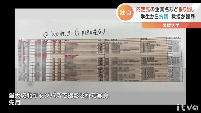 学生の内定先貼り出す 愛媛大教授「コミュニケーションのつもりだった」謝罪 2022年12月23日(金) 16:59 国内 愛媛大学の男性教授が、4回生の学生の氏名と就職の内定先などを記した紙をキャンパス内に貼り出し、学生からの抗議を受け、謝罪していたことが分かりました。あいテレビが関係者から入手したこちらの写真。愛…