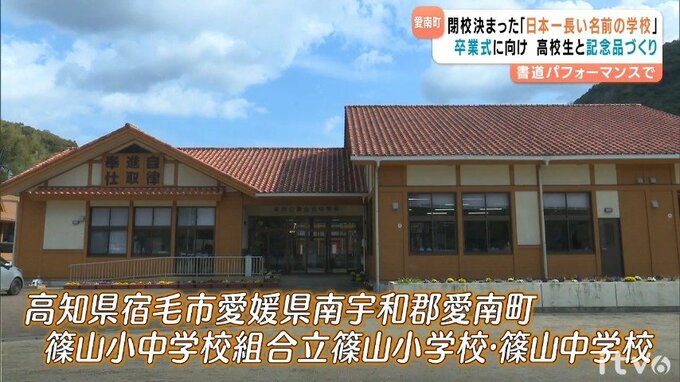 日本一長い名前の学校「高知県宿毛市 愛媛県南宇和郡愛南町 篠山小中学校組合立 篠山小学校・篠山中学校」で閉校前に記念品づくり 2026年3月12日(木) 17:46 国内 来年度の閉校が決まっている、愛媛と高知の県境にある日本一長い名前の学校で、卒業式に向けた記念品づくりが行われました。校区が愛媛と高知の両県にまたがっていて、日本一長い名前の学校、正式名称「高知県…