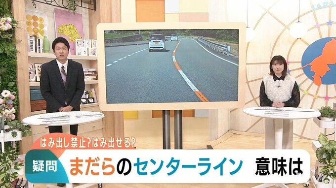 「こちら道路のセンターラインが、オレンジ色と白色のまだらな模様になってい