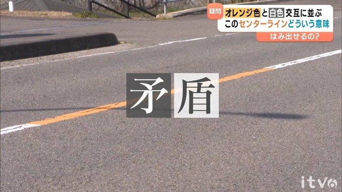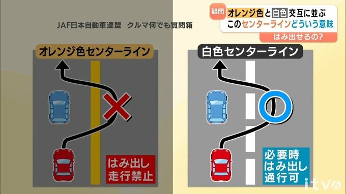 JAF・日本自動車連盟の「クルマ何でも質問箱」によると、オレンジ色のセンターラインは「はみ出し走行禁止」。