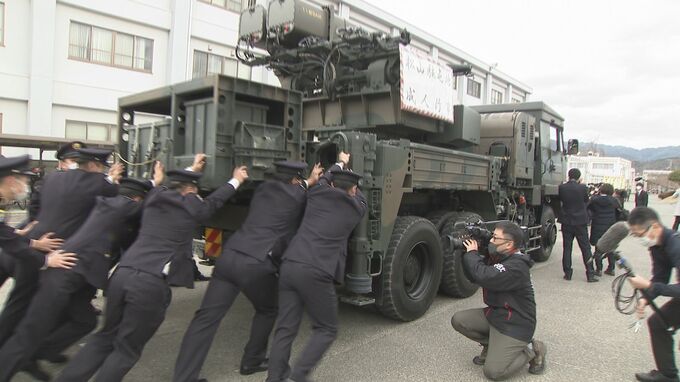先輩らに激励される中、隊員たちはおよそ30メートル先のゴールラインまで引っ張りました。