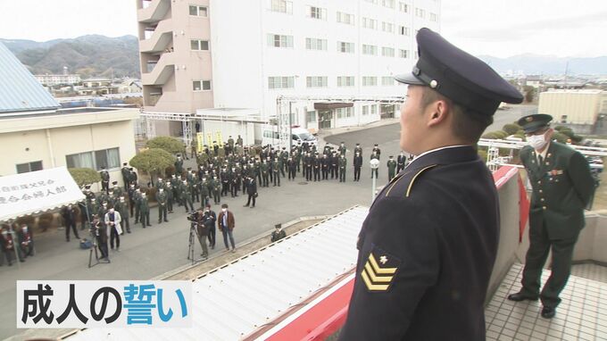 18歳以上に成人年齢が引き下げられて初めてとなる式典は、名称がこれまでの「成人式」から「成人行事」に変更され、今年度20歳となる25人の隊員を対象に行われました。