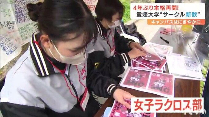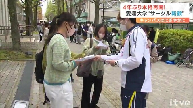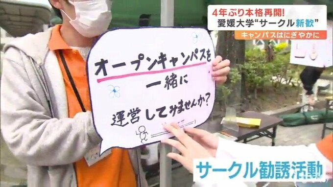 愛媛県松山市は文京町の愛媛大学でも、コロナ禍で縮小していたサークルの勧誘活動が4年ぶりに本格再開され、新入生に向けたあれやこれやのPR合戦が行われていました。