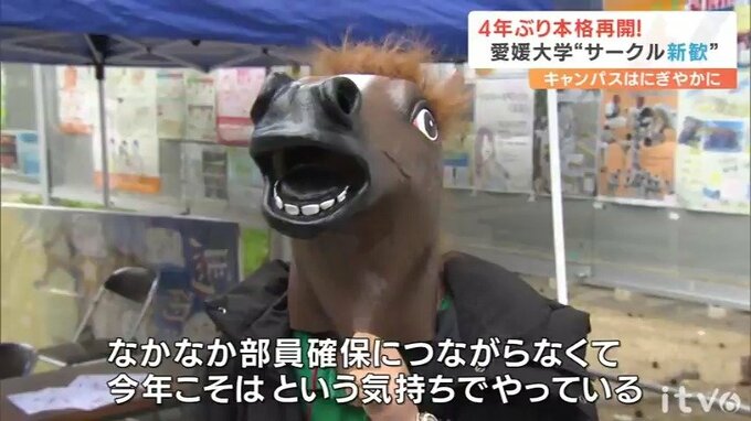 馬に乗った状態で演技の正確さや美しさを競う馬術。愛媛大学馬術部は、松山市内の専用グラウンドにある小屋で5頭の馬を飼育しながら活動しています。しかし、去年までは勧誘活動の制限によって新入生が馬と触れ合う機会などを設けられず、活動の魅力を伝えきれなかったといいます。
