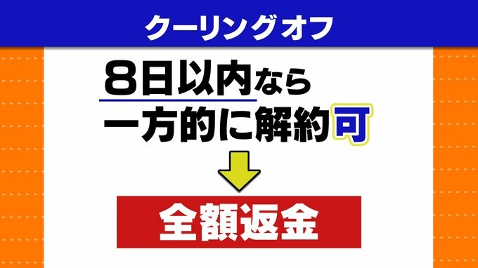 「消費者が一方的に解約できる制度にクーリングオフ制度があります。この中には特定のサービスが含まれています。ご覧の7種類サービスに限られますが、クーリングオフの対象です。これらが対象に含まれた背景には、過去に中途解約ができなかったり、高額な違約金が請求されるなどのトラブルが多発したことがありました。クーリングオフですから、まず8日以内だと一方的に解約可能で、基本的に全額返金されます」