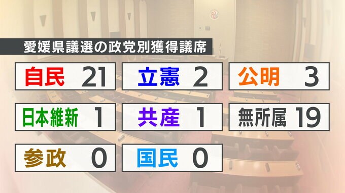 県議会は、共産など一部の議員を除いて「ほぼオール与党体制」とも言われてきましたが、改選後も、議会と中村時広知事との関係に変化状況に変化はないと見られます。