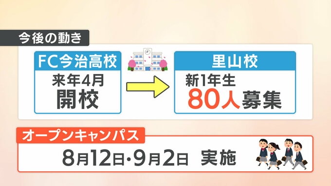 FC今治高校は来年4月の開校に向け、里山校では新1年生80人を募集する計画で、オープンキャンパスも予定されています。