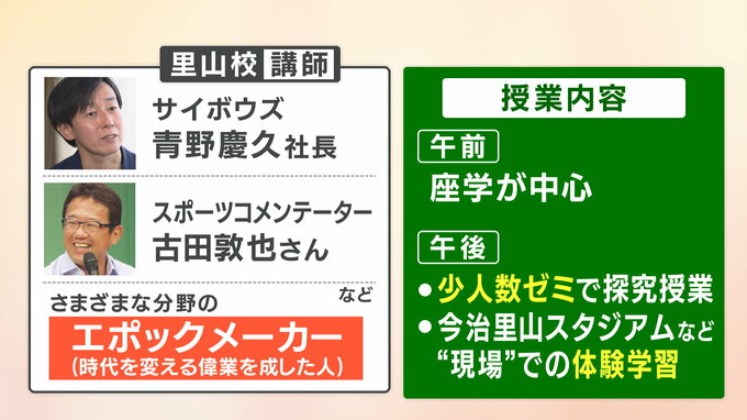 里山校の講師陣には、IT企業・サイボウズの青野慶久(よしひさ)社長やスポーツコメンテーターの古田敦也さんなど“エポックメーカー(=時代を変える偉業を成したと言える人物)”たちが名を連ねています。授業でも、午後に少人数での探究学習や、今治里山スタジアムなど“現場”で体験する授業が組まれる予定です。