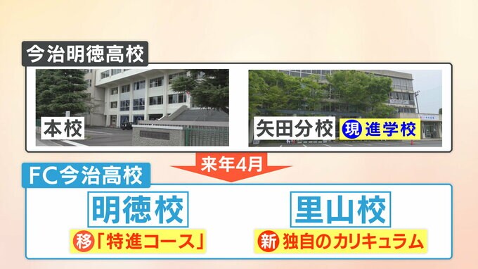 現在、今治明徳高校には本校と矢田(やた)分校がありますが、来年4月からは、FC今治高校の「明徳校」「里山校」に名前が変わります。現在の矢田分校は、大学進学を目的としたいわゆる進学校の役割を担っていますが、これは明徳校に新設される「特進コース」に引き継がれます。