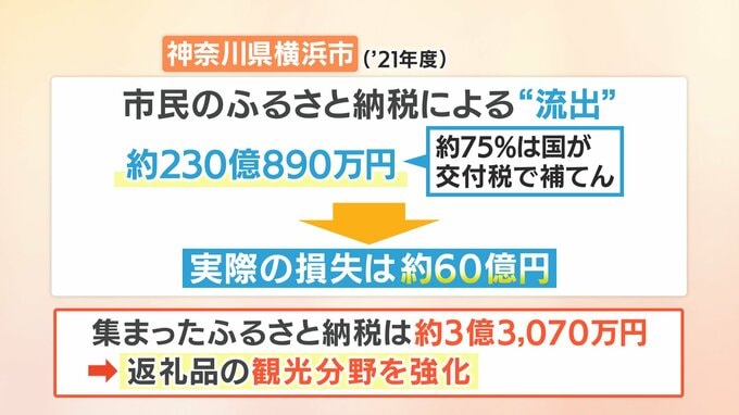 ただ、ふるさと納税に伴う減収分(=市民による納税額)の約75%は国からの交付税で補われます。そのため横浜市の場合、実際の損失は230億円の25%=約60億円だったそうです。