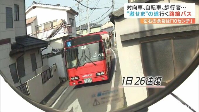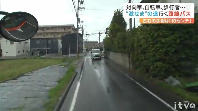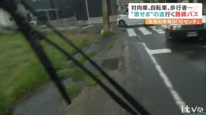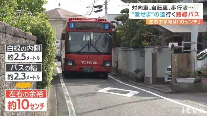 この辺りの道幅は、白線の内側で約2.5メートル。バスの幅が2.3メートルなので、左右の余裕は、実に10センチ程度ということに。まさに「すご技」です。