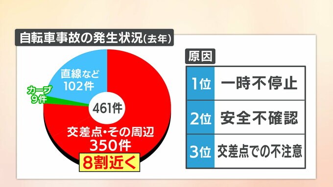 また、自転車の絡む事故の8割近くが交差点やその周辺で起きていて、一時停止の怠りや安全をよく確認しないまま交差点に進入したことが主な原因だということです。