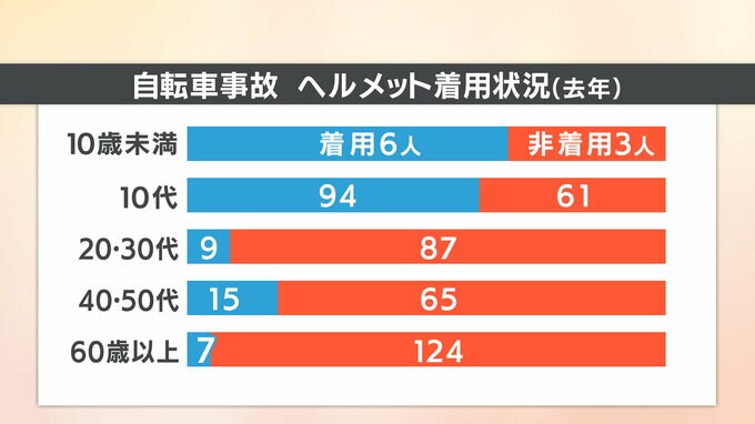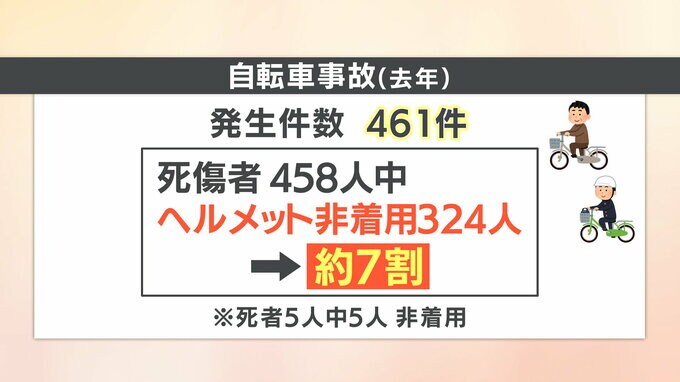 愛媛県警によりますと、去年発生した自転車事故で死傷者458人のうち、324人、約7割が、ヘルメットを着用していなかったということです。このうち亡くなった5人は全員着用していませんでした。