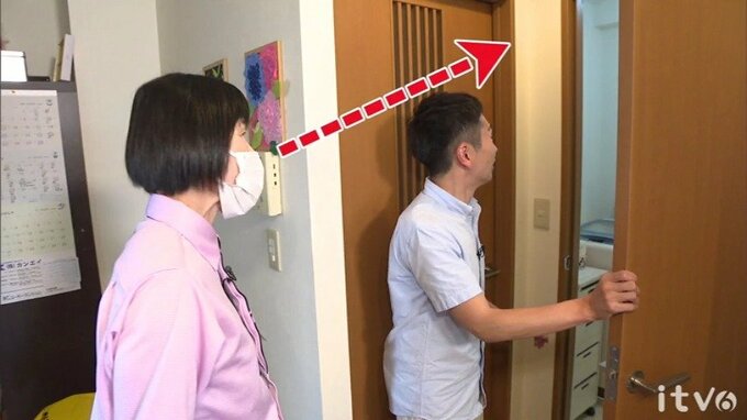 …と、洗面所のドアを開けた時、忽那さんの目線は…なぜかドアの上へ。