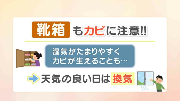 また、お風呂以外に湿気が溜まりやすいのが、靴箱です。カビが生えてしまう事例もあるそうで、天気の良い日には部屋とともに靴箱の換気も心掛けてみてください。