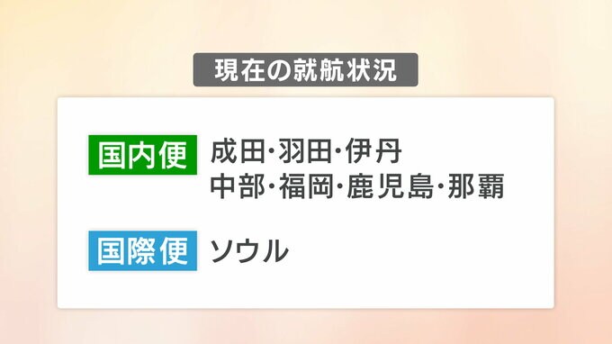 国内便は、成田線のほか、東京・羽田、大阪・伊丹や福岡、愛知・中部など合わせて8つの路線が、また国際便はソウルと上海の2路線が運航していました。