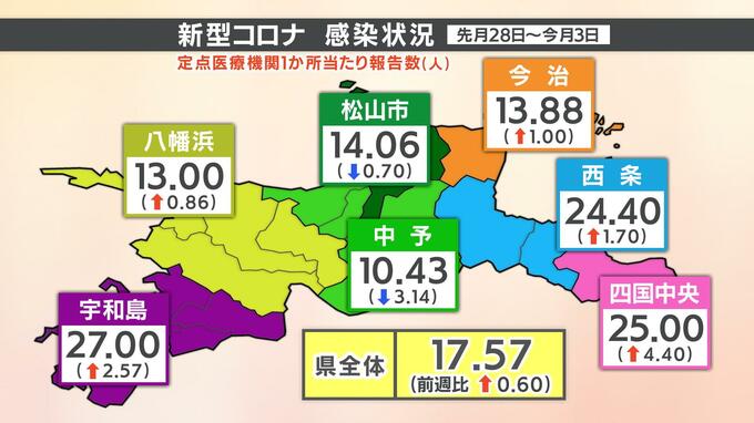 愛媛県 新型コロナ感染者 前週から微増 12件のクラスターも 2023年9月8日(金) 15:47 国内 8月28日~9月3日までの1週間に、愛媛県内の定点医療機関1か所あたりから報告された感染者の数は17.57人で、前の週から0・6人増加しました。保健所別では以下の通りです(括弧内は前週比)。▼四国中央25.00人(+4.…