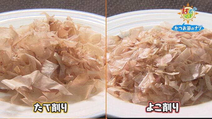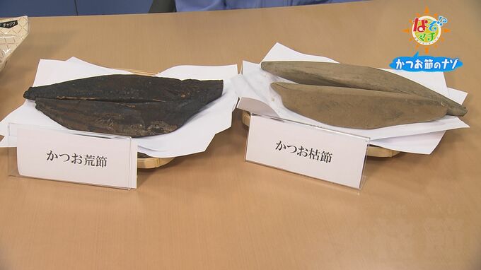 かつお節は、下ろした鰹の身を煮て燻したもの。何度も燻し、水分を飛ばして凝縮させたものが「荒節(あらぶし)」、そこにカビ付けしたのものが「枯節(かれぶし)」と呼ばれます。カビが付いたほうが上品でまろやかな旨みを感じられるんだとか。