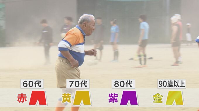 ところで、さまざまな色のパンツを着用しているメンバーたち。これは、上の年代にはタックルできないという、シニアラグビーならではのルールがありその目印になっているんです。60代は赤、70代は黄色、80代は紫、そして、90歳以上は金色。