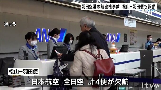 羽田空港の航空機事故 Uターンラッシュの松山空港でも影響 2024年1月3日(水) 17:25 国内 2日、羽田空港の滑走路で日本航空機と海上保安庁機が衝突した事故の影響で、松山空港でも羽田とを結ぶ便に影響が出ています。2日、羽田空港で発生した日本航空機と海上保安庁機の衝突、炎上事故。この事故で松…