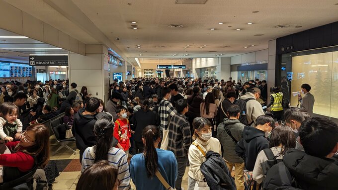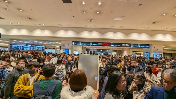 通路の端に次々と並べられていく、おびただしい数のトランクケース。 どの欠航便の荷物が、どの場所に置かれているのか、アナウンスはない。