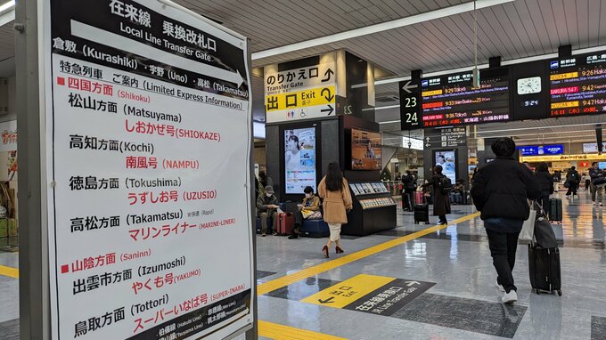 松山へ向かう特急列車「しおかぜ」は午前10時35分に岡山を発車、松山駅に着くのは、およそ2時間半後の午後1時15分となるのだ。