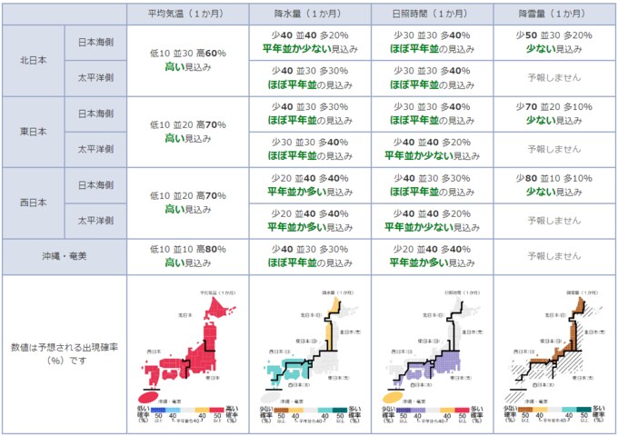 寒気の影響を受けにくいため、向こう1か月の気温は高いでしょう。特に、期間の前半は気温がかなり高くなる可能性があります。また、冬型の気圧配置が長続きしないため、降雪量は少ないでしょう。