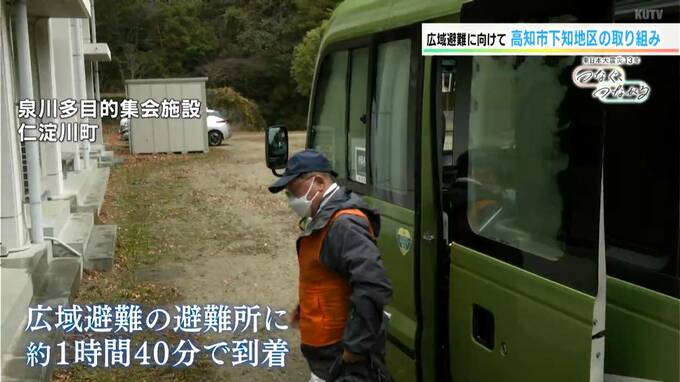 1月、高知市で行われた防災訓練には、下知地区減災連絡会のメンバーらも参加しました。津波浸水を想定した救助訓練に続いて行われたのが、「広域避難」の訓練です。減災連絡会では、南海トラフ地震発生後、仁淀川町に避難することを決めています。実際の広域避難の訓練は県内でも初めて。バスで仁淀川町に向かい、避難先に着くまでの経路や山肌の危険か所などを確認し、広域避難の避難所に指定されている集会所に1時間40分ほどかけて到着しました。