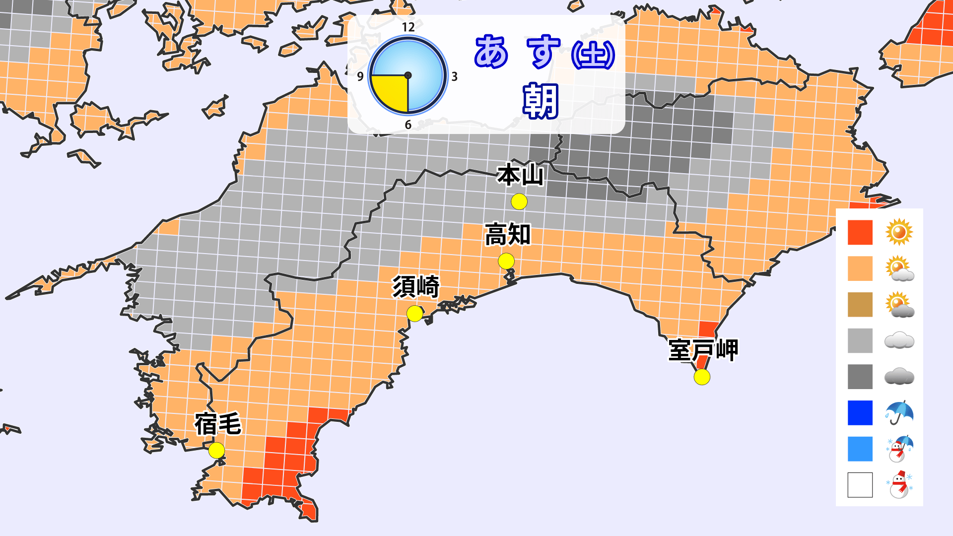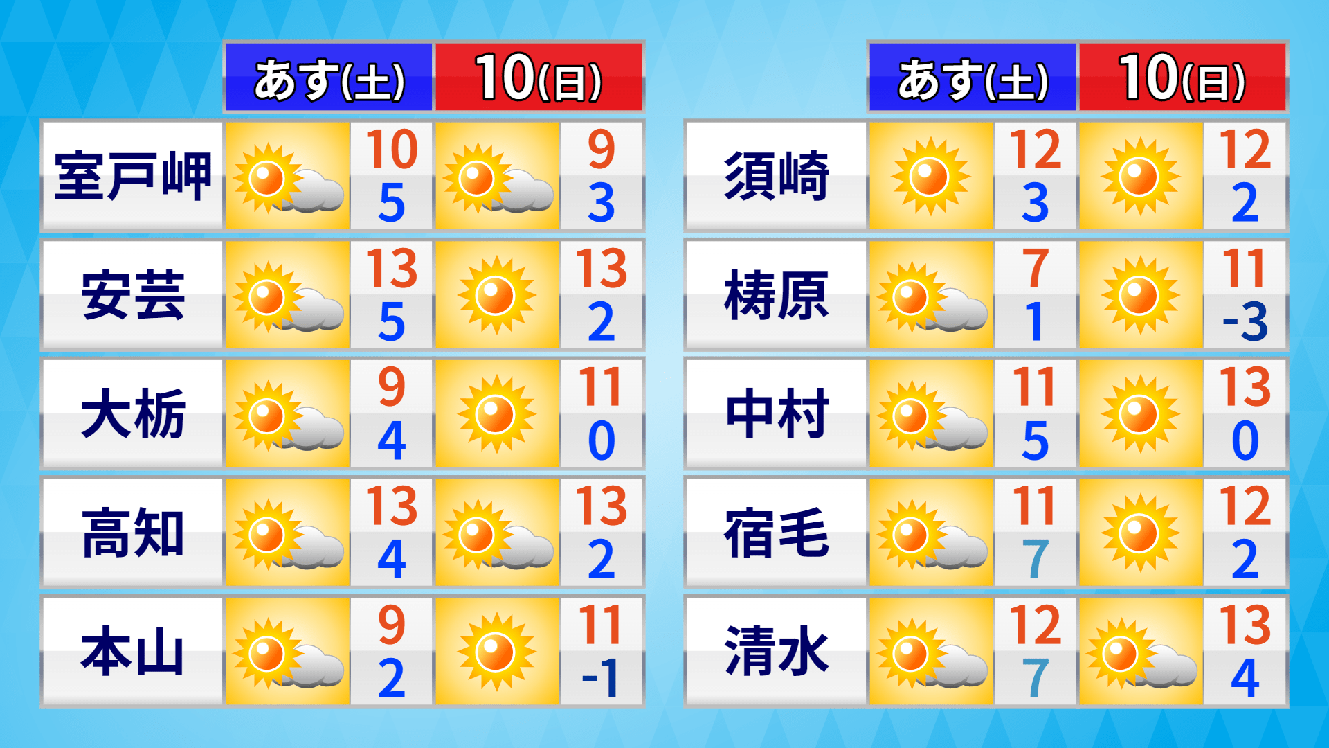 9日、10日の土日は高知県内全域で青空が広がり、お出かけ日和となるでしょう。ただ、寒気が流れ込む影響で気温は上がらず、特に日曜日の朝は各地で冷え込みが強くなりそうです。